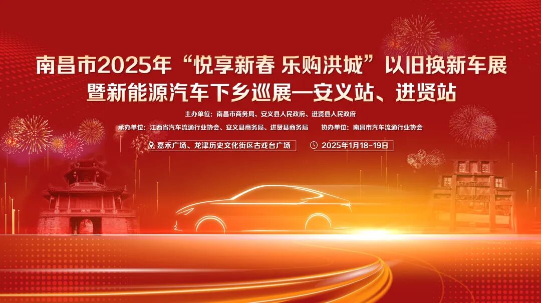 “南昌市2025年“悦享新春 乐购洪城”以旧换新车展 暨新能源汽车下乡巡展”将于1月18日和1月19日(周末二天)分别在进贤嘉禾广场和安义龙津历史文化街区古戏台广场陆续开展。
